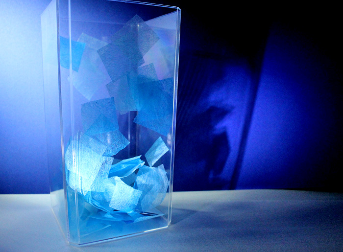 透明ケースに和紙をハラハラ落とす