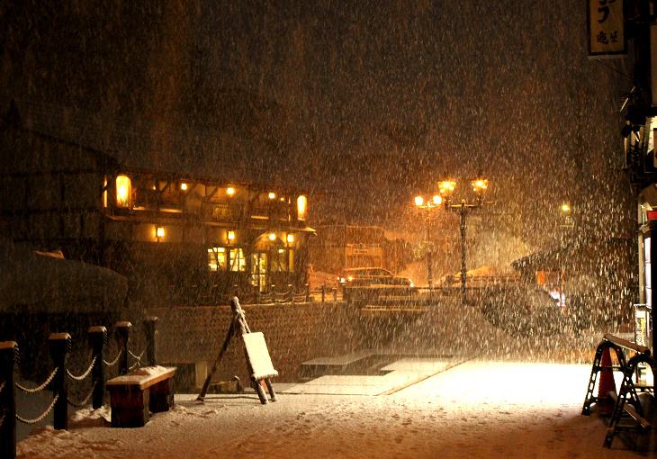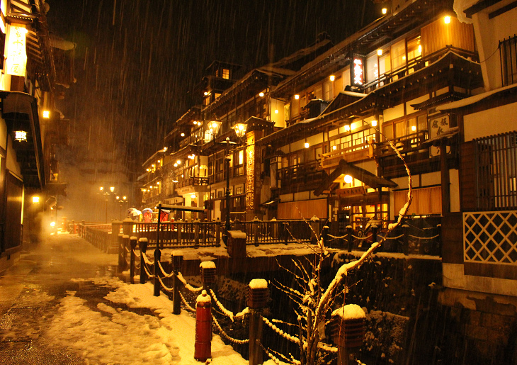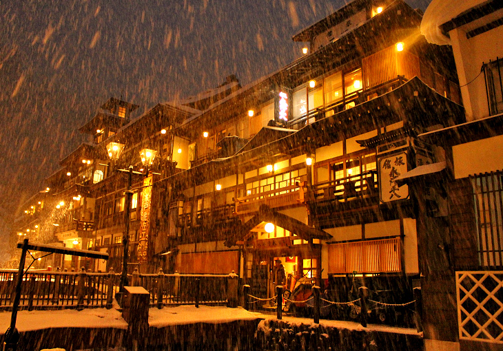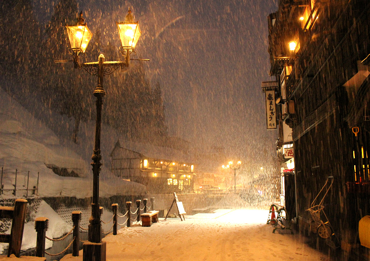 銀山温泉、雪の夜景